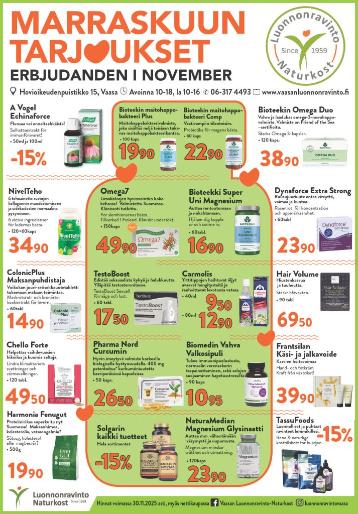 Jos sinulla on kysyttävää, ota yhteyttä meihin sähköpostitse info@vaasanluonnonravinto.fi, tai oheisella lomakkeella. Puhelimitse saat meidät kiinni numerosta 06-3174493.